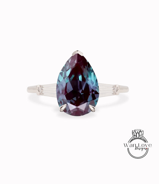 Alexandrite & Diamond Pear Tapered Baguette 3 gem stone Art Deco Moissanite Diamond Engagement Ring Custom Wedding Bridal Ring Anniversary Gift
