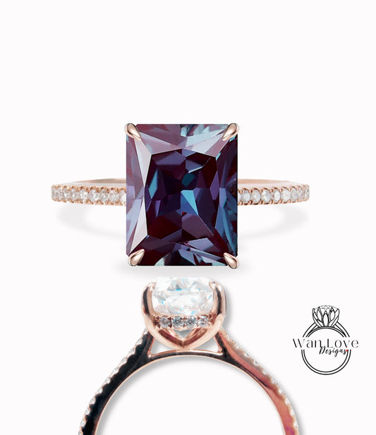Alexandrite & Diamond Side Halo half halfway eternity Engagement Ring, Emerald cut Pave Rim wedding bridal ring 14kt 18kt Solid Gold Anniversary Gift