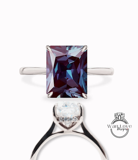 Alexandrite & Diamond Side Halo plain tapered band shank Engagement Ring, Emerald cut Dainty Minimalist Pave Rim wedding bridal ring 14kt 18kt Solid Gold Anniversary Gift