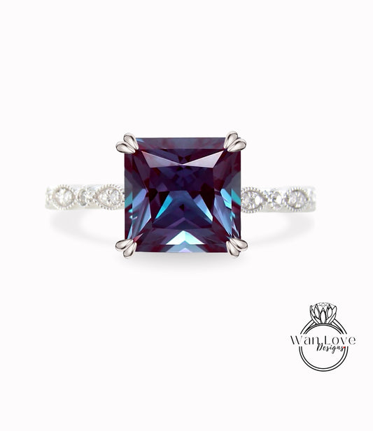 Alexandrite & Diamond Side Halo Princess Engagement Ring, 3/4 Almost Eternity, Custom, Square, 14kt 18kt Gold, Platinum, Anniversary Gift