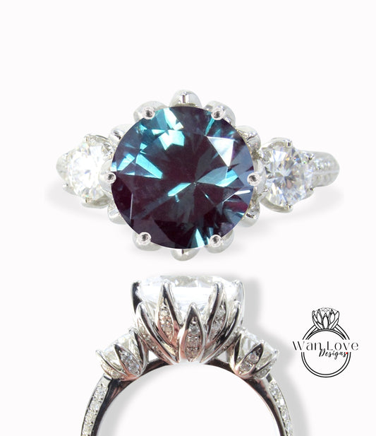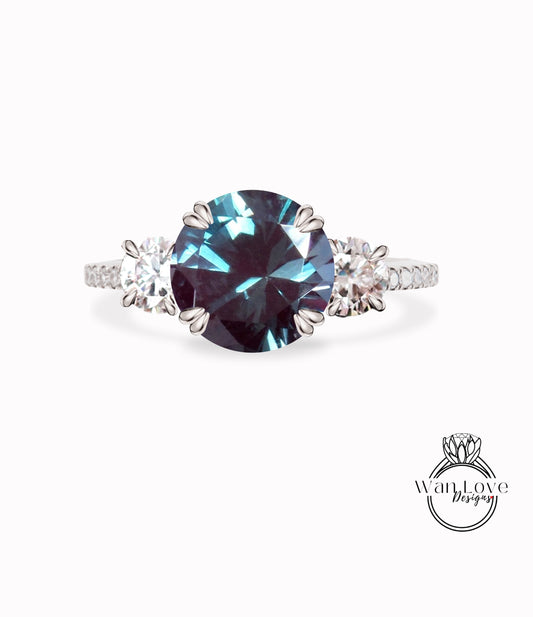 Alexandrite & Diamond 3 gemstone engagement Ring Diamond Round Three gem Stone bridal wedding Ring Anniversary Gift