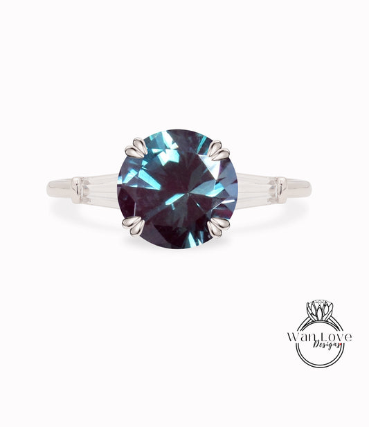 Alexandrite & Diamond Round Tapered Baguette 3 gem Engagement Ring, Custom Moissanite lab diamond 14k 18k White Yellow Rose Gold Platinum Wedding bridal ring, Anniversary gift
