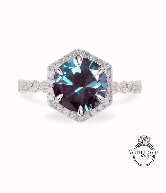 Alexandrite & Diamond Hexagon Halo Scalloped Engagement Ring, Round cut Ring, Milgrain Vintage leaf wedding Bridal Ring, Anniversary Gift