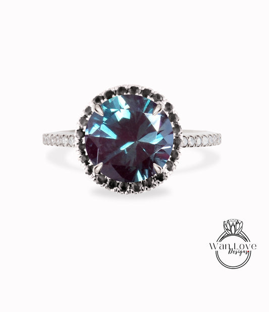 Alexandrite & Black Diamond Round Halo Engagement Ring, Color Change, Custom, Wedding, 14kt 18kt White Rose Yellow Gold, WanLoveDesigns