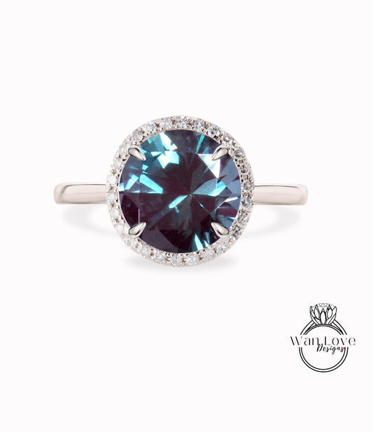 Alexandrite & Diamond Round Halo Plain Shank Engagement Ring Custom Wedding 14kt 18kt Gold, Platinum, WanLoveDesigns