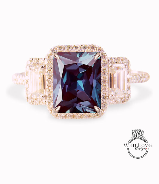 Alexandrite & Diamond 3 gem stone Emerald Cut with Tapered Baguettes Engagement Ring 14k 18k White Yellow Rose Gold-Platinum-Custom-Anniversary Gift