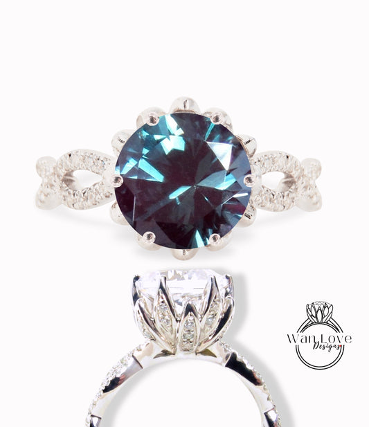 Alexandrite & Diamond Lotus Flower Infinity Twisted Round Engagement Ring, 14kt 18kt Gold-Platinum-Custom-Wedding ring-Anniversary Gift