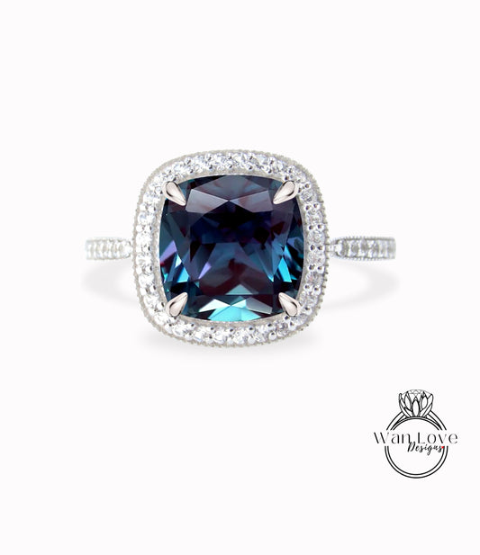 Cushion Cut Alexandrite Engagement Ring, Diamond/Moissanite Halo Wedding Ring, Half Eternity Diamond Milgrain Custom Ring, 14k/18k Gold Ring
