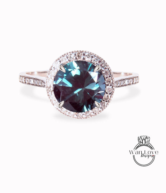 Diamond Halo Gold Ring/ Round Alexandrite Center Ring/ Engagement Ring/ Anniversary Ring/ Promise Ring/ Halo Milgrain Ring