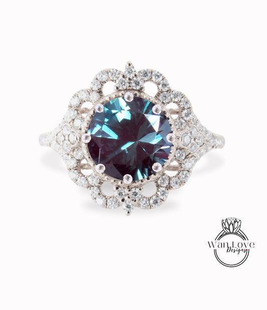 Vintage round shape alexandrite engagement ring ornate halo moissanite diamond ring rose gold ring 8 prong set ring anniversary ring gift