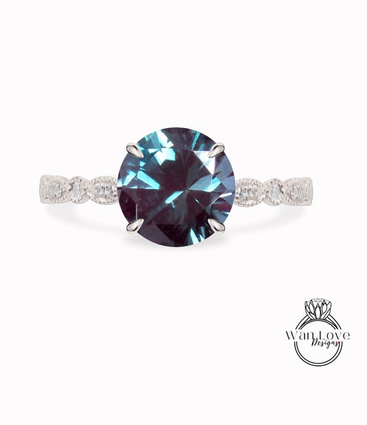 Round Alexandrite Ring Vintage Solid Rose Gold Engagement Ring scalloped Diamond Wedding Ring Art Deco milgrain Promise Anniversary gift