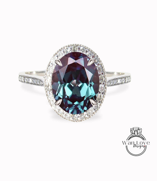 Alexandrite & Diamond Oval Halo 3 sided Engagement Ring, 14k 18k White Yellow Rose Gold, Platinum, Wedding, Anniversary Gift