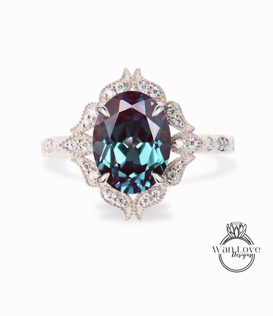 Oval Alexandrite Diamond Ring, Floral Diamond Ring with Alexandrite, Alexandrite Milgrain Ring, Color Change Engagement Ring, Custom