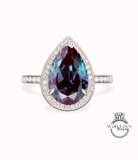 Vintage engagement ring Alexandrite ring rose gold Pear cut diamond ring milgrain halo art deco ring wedding Anniversary ring bridal ring