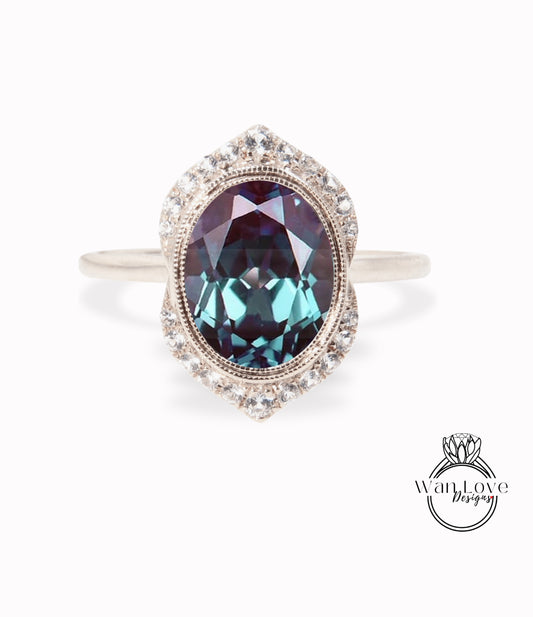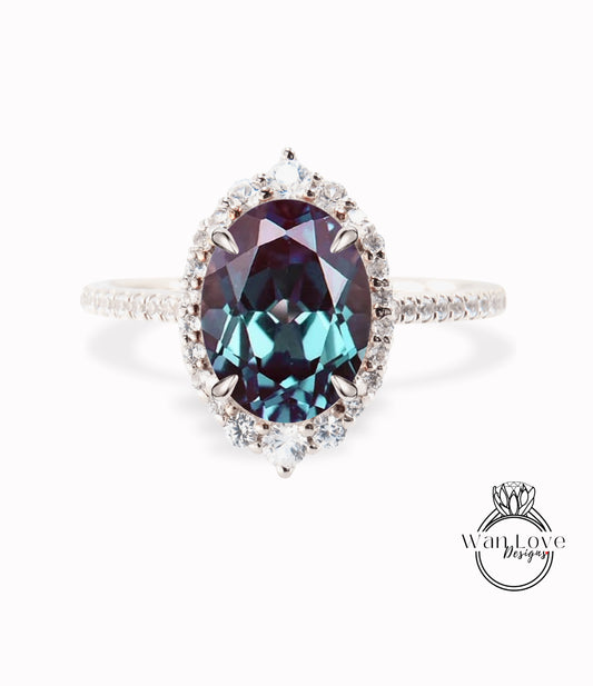 Alexandrite & Diamonds Oval Graduated Halo Engagement Ring, Custom, Wedding, Anniversary Gift,14k 18k White Rose Yellow Gold, WanLoveDesigns