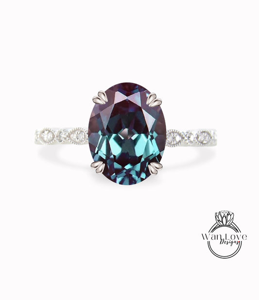 Vintage Oval cut Alexandrite engagement ring Rose gold ring Art deco Diamond Milgrain antique wedding Bridal Anniversary ring promise ring