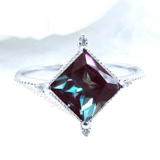 Alexandrite & Diamond Milgrain Kite NSEW Princess Engagement Ring, Custom,14k 18k White Yellow Rose Gold-Platinum,Wedding, WanLoveDesigns