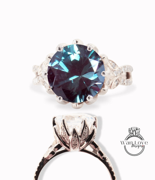 Lotus Alexandrite Ring Vintage Lotus flower Round Alexandrite Ring Alexandrite Diamond Emerald Floral Engagement Ring Promise Wedding Ring