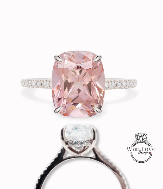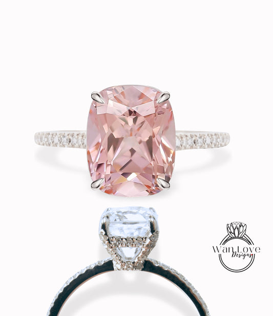 Peach Sapphire & Diamond Elongated Cushion Side Halo 3/4 almost eternity Engagement Ring Diamond prongs basket ring, Custom, Wedding Bridal Anniversary Gift