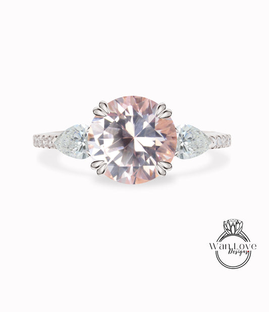 Peach Sapphire Round Pear Diamond Ring, Three Stone Moissanite Ring, Round sapphire engagement Ring, Diamond Band Ring