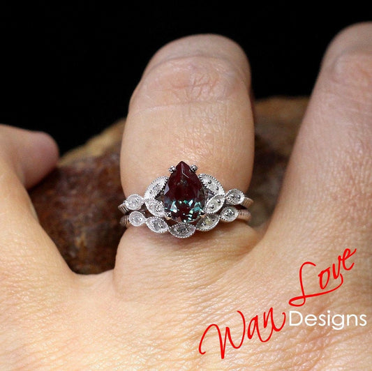Pear Alexandrite engagement ring set rose gold Diamond ring Unique vintage leaf milgrain Curved Wedding band ring Bridal Anniversary gift