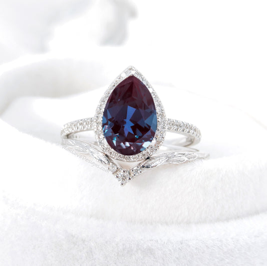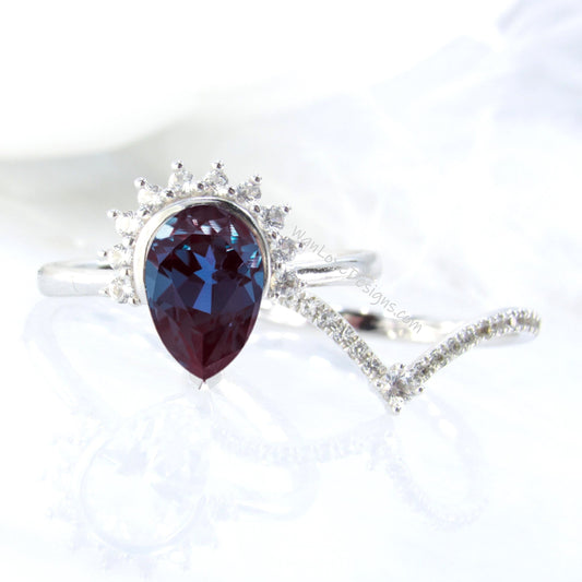 Pear Alexandrite engagement ring set vintage Crown semi bezel halo white gold engagement ring women Chevron v Diamond wedding Bridal gift