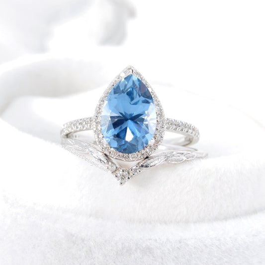 Pear Aquamarine Spinel Diamond Halo and Curve Band Engagement Ring Set | 14K Gold Nesting Band | Leaves Bridal Ring | Nature Inspired Ring