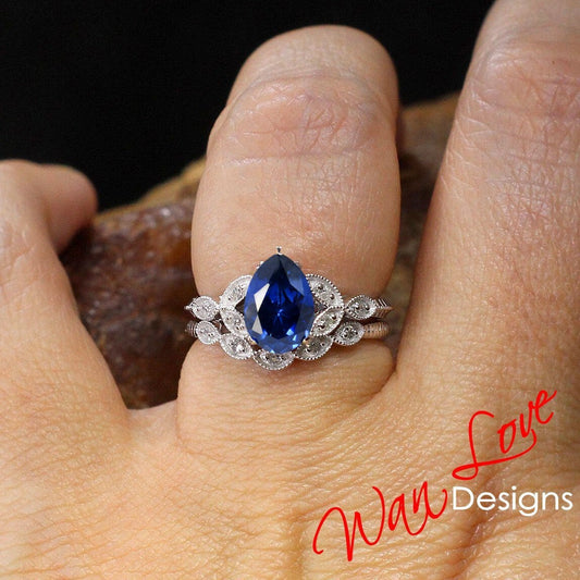 Pear Blue Sapphire engagement ring set rose gold Diamond ring Unique vintage leaf milgrain Curved Wedding band ring Bridal Anniversary gift