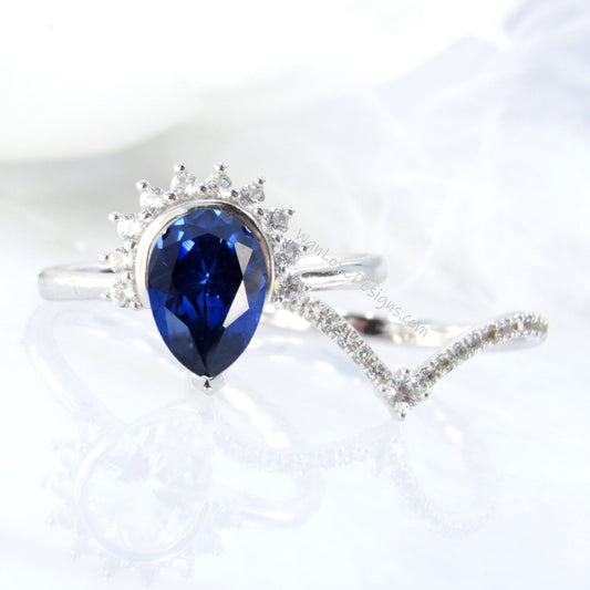 Pear Blue Sapphire engagement ring set vintage Crown semi bezel halo white gold engagement ring women Chevron v Diamond wedding Bridal gift