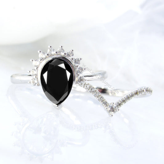 Pear Black Spinel Diamond Crown Half Halo Engagement Ring Set V Curved Wedding Band Semi Bezel, 14k 18k White Yellow Rose Gold,Custom