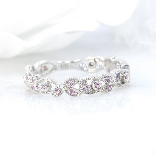 Pink Sapphire Milgrain Filigree Art Deco style Full Eternity Stack Wedding Band-Engagement Ring-Anniversary-Silver Rhodium-Ready to ship
