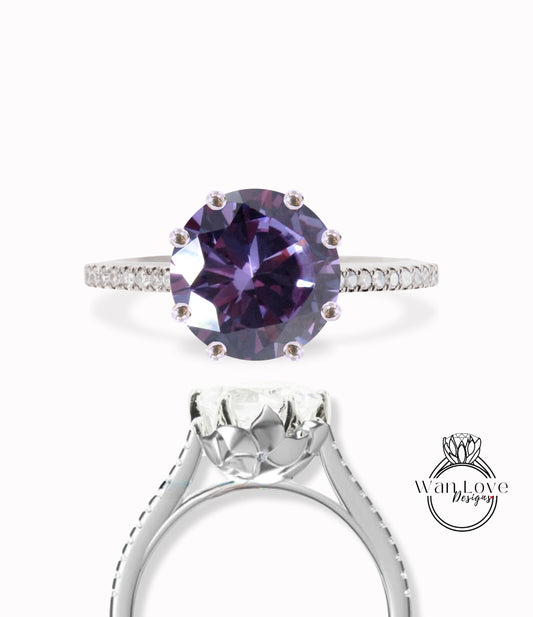 Purple Color Change Alexandrite Color Sapphire & Diamond prongs Basket Round Engagement Ring, Side Halo, Hidden, 3/4 Almost Eternity, Custom, Wedding, Anniversary