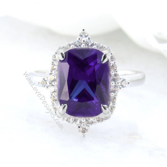 Purple Sapphire Alexandrite Color & Diamond Elongated Cushion Side Halo Half Eternity Engagement Ring rose gold Ring Art Deco Wedding Bridal Ring Anniversary Gift