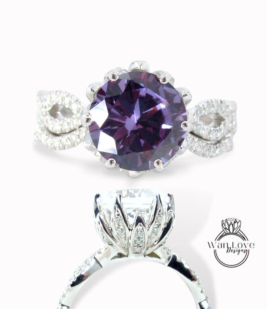 Purple Sapphire Alexandrite Color & Diamond Lotus Flower Infinity Twisted Round Engagement Ring, 14kt 18kt Gold-Platinum-Custom-Wedding ring-Anniversary Gift