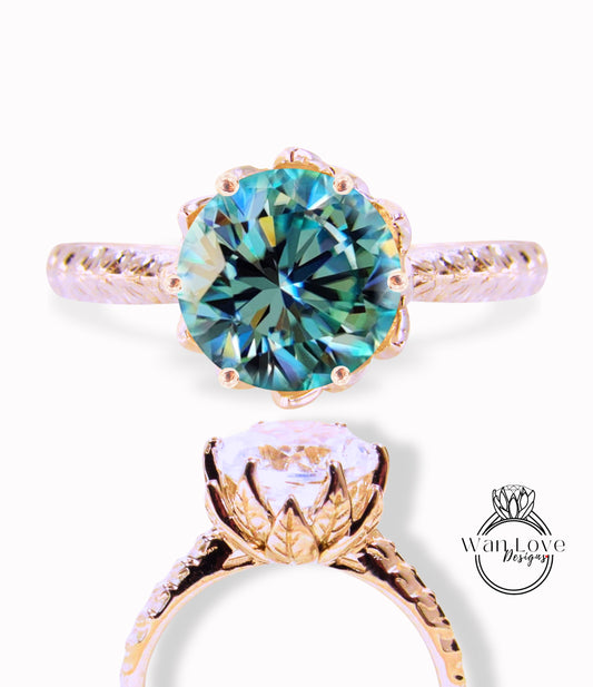 Round cut Blue Moissanite engagement ring vintage Lotus Flower engagement ring woman nature leaf ring Unique Bridal ring Anniversary gift
