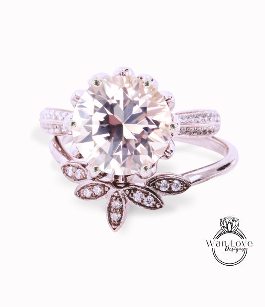Round cut Light Pink Sapphire & Diamond engagement set vintage White gold Lotus Flower engagement ring woman Diamond wedding set Unique Bridal Anniversary set