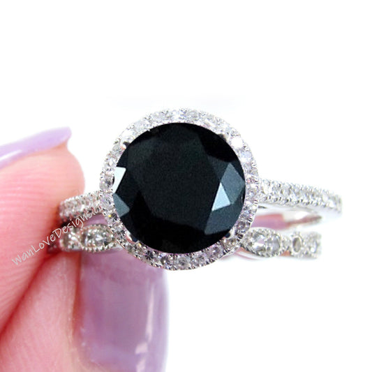 Round cut Black Spinel engagement ring set vintage white gold Halo engagement ring half eternity leaf Diamond wedding Bridal Promise gift