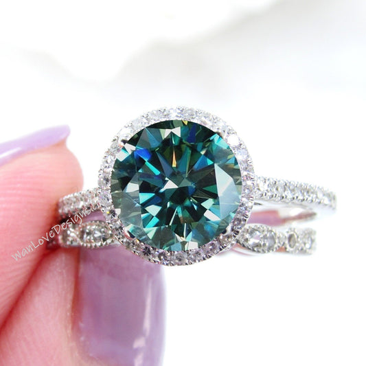 Round cut Blue Moissanite engagement ring set vintage white gold Halo engagement ring half eternity leaf Diamond wedding Bridal Promise gift