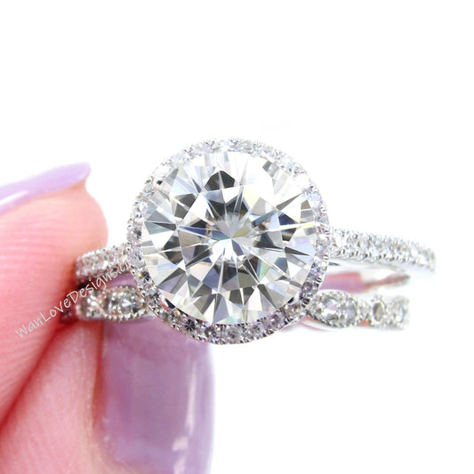 Round cut Moissanite engagement ring set vintage white gold Halo engagement ring half eternity leaf Diamond wedding Bridal Promise gift