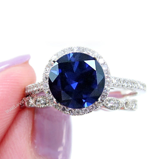 Round cut Blue Sapphire engagement ring set vintage white gold Halo engagement ring half eternity leaf Diamond wedding Bridal Promise gift