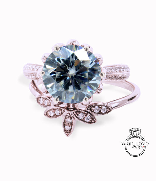 Round Gray Moissanite engagement set vintage Rose gold Lotus Flower engagement ring woman Diamond wedding set Unique Bridal Anniversary set