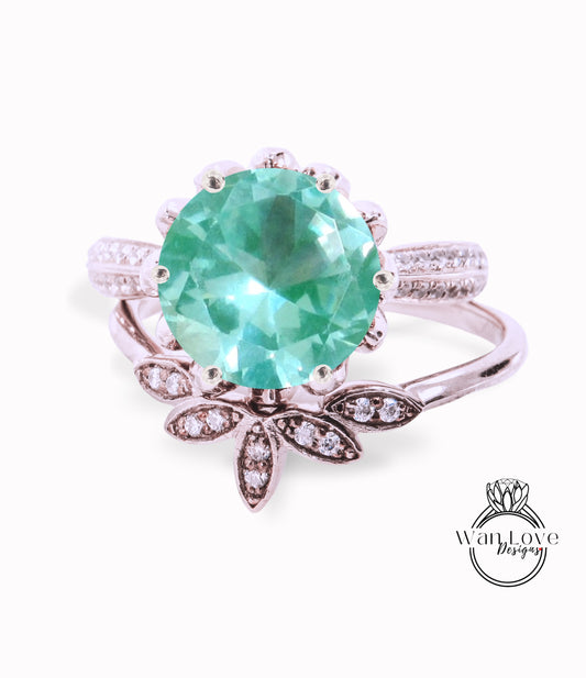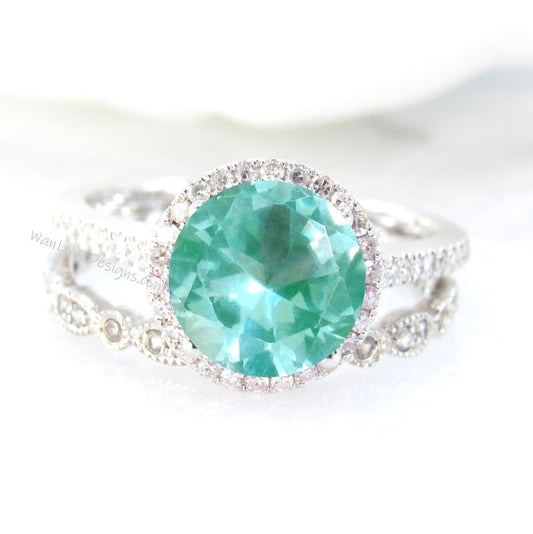 Round cut Teal Spinel engagement ring set vintage white gold Halo engagement ring half eternity leaf Diamond wedding Bridal Promise gift