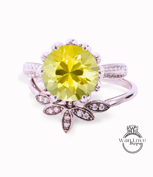 Round cut Yellow Sapphire & Diamond engagement set vintage White gold Lotus Flower engagement ring woman Diamond wedding set Unique Bridal Anniversary set