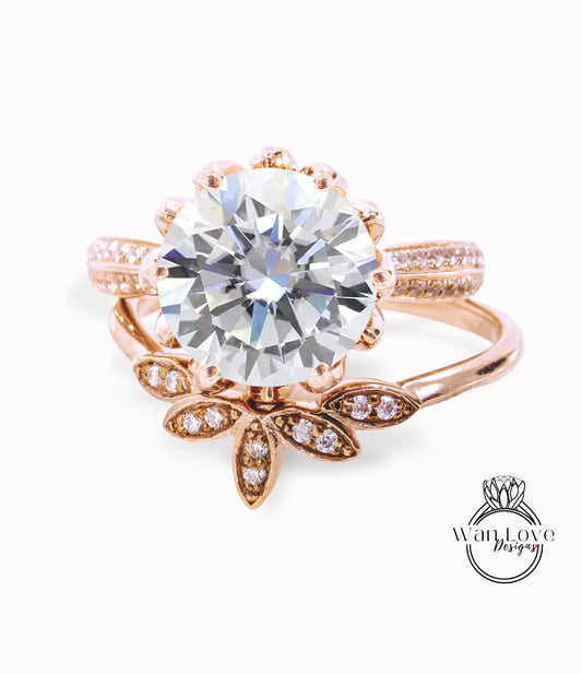 Round Diamond engagement ring set vintage Rose gold Lotus Flower engagement ring woman Certified Diamond bridal wedding set Unique Bridal Anniversary set