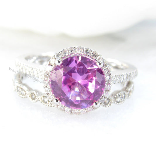 Round cut Pink Sapphire engagement ring set vintage white gold Halo engagement ring half eternity leaf Diamond wedding Bridal Promise gift