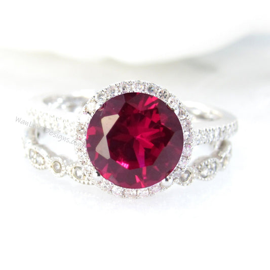Round cut Ruby engagement ring set vintage white gold Halo engagement ring half eternity leaf Diamond wedding Bridal Promise gift