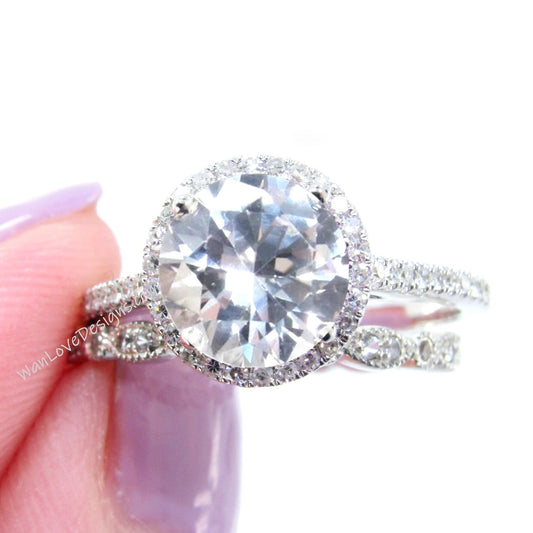 Round cut White Sapphire engagement ring set vintage white gold Halo engagement ring half eternity leaf Diamond wedding Bridal Promise gift
