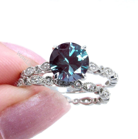 Alexandrite Round Diamonds WITH Milgrain Wedding Set Rings Rings, 14kt Solid Rose Gold, WanLoveDesigns