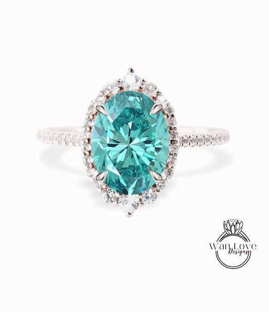 Vintage 2ct engagement ring|Unique Blue moissanite diamond halo wedding ring|Cluster Oval shaped halo Bridal ring|Antique Anniversary ring