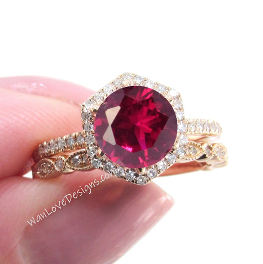 Vintag Ruby Engagement Ring Rose gold Women Diamond Hexagon Halo wedding set Vintage Bridal set Promise ring Anniversary ring